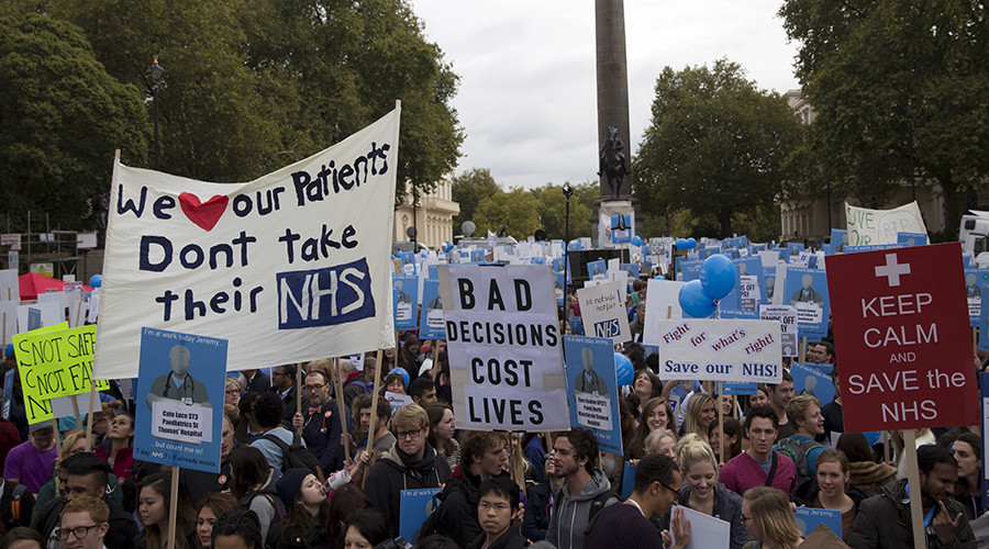Más de 20.000 personas se manifestaron este sábado en Londres, la capital, en oposición a las reformas neoliberales que el Gobierno de David Cameron pretende imponer en los contratos de los médicos en formación del sistema público (NHS).